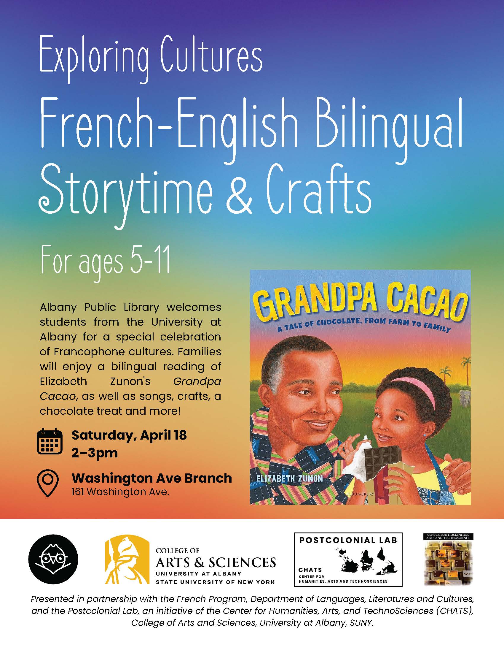Story-time Please join me as I support the French Program University at Albany students in their very special bilingual story-time of Grandpa Cacao: a Tale of Chocolate, From Farm to Family! They have been hard at work creating a celebration of Francophone cultures with songs, crafts, and activities! Please come! (even if you don't speak French!) Yes, there will be chocolate... Saturday, April 18, 2026 from 2-3pm at the Albany Public Library, Washington Ave Branch Community Room, Albany, NY. |